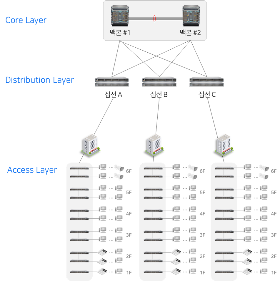 전통적인 3 Tier 계층구조를 적용하는 경우 네트워크 설계, 배치가 용이하고 신뢰성과 확장성이 높습니다. 네트워크 구조가 직관적이기 때문에 사용자(직원) PC, IP전화기, CCTV, 무선AP 등의 단말 네트워크 관리가 용이합니다.