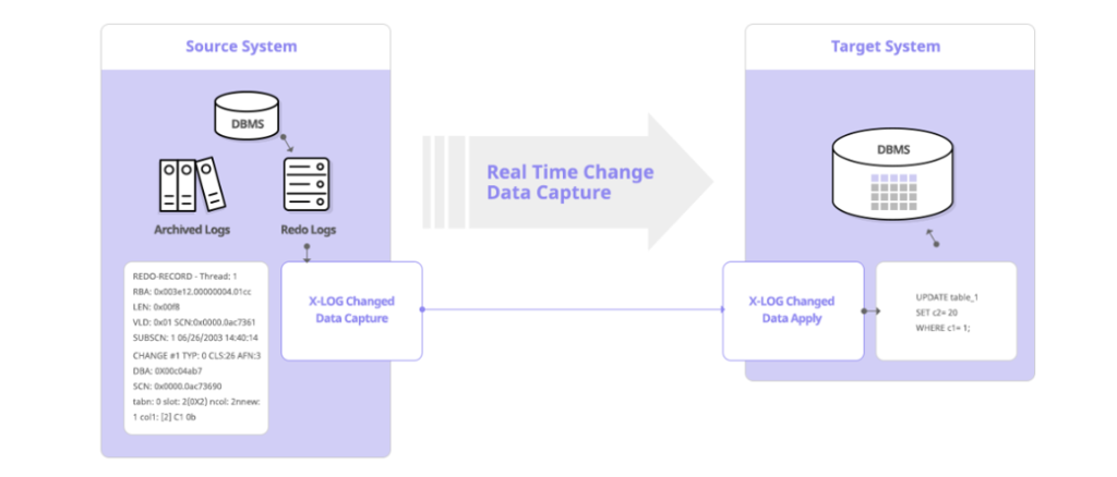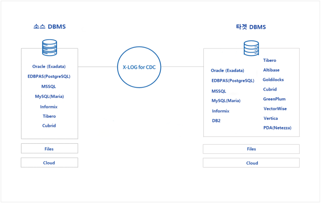 X-LOG for CDC는 CDC(Change Data Capture)기반 복제 기법을 사용하여 데이터베이스의 변경된 트랜잭션만 Redo log로 부터 추출하여 복제하는 실시간 DB 복제 솔루션