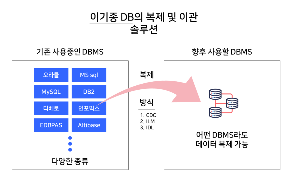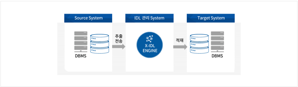 특징 : IDL(Initial Data Loader)는 DBMS 시스템에 대한 시스템 교체, 업그레이드 및 이기종 DBMS간 데이터 이관시 별도의 스토리지 공간을 사용하지 않고 소프트웨어 에이전트를 통해 초기 데이터를 이관해 줄 수 있는 최적의 솔루션